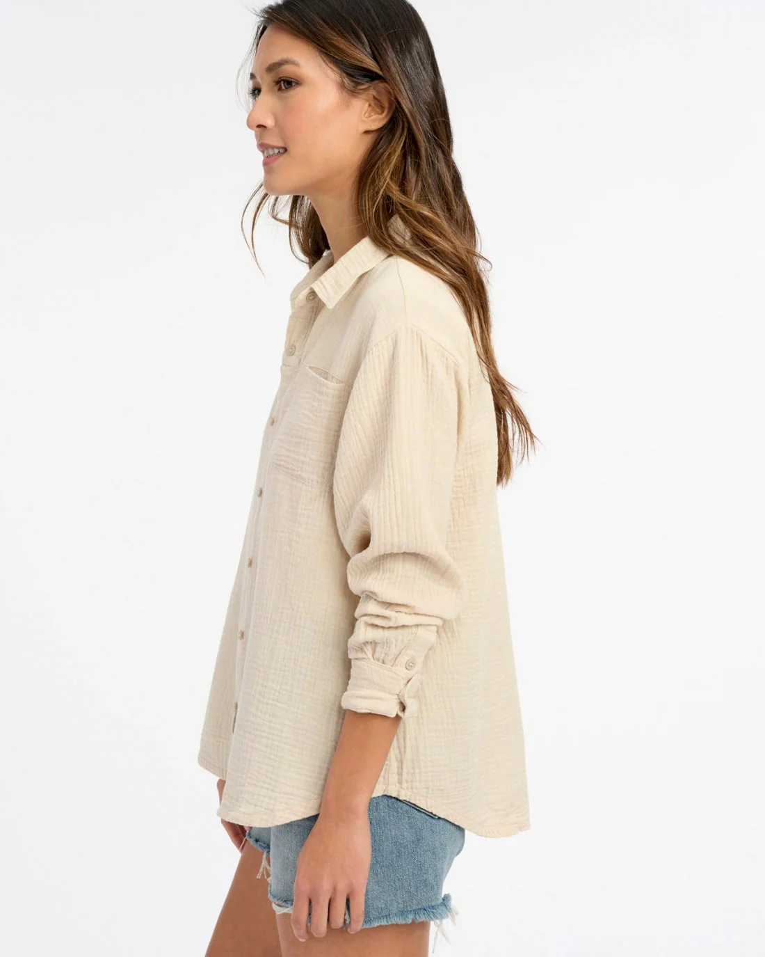 With a classic button-up silhouette and a textured finish, our Addie Shirt is a must-have summer staple. Crafted from 100% cotton double layer crepe so even with its long sleeves, it's breathable and lightweight enough for warm weather. We love it most tucked into the matching Addie Short or Addie Cropped Pant.