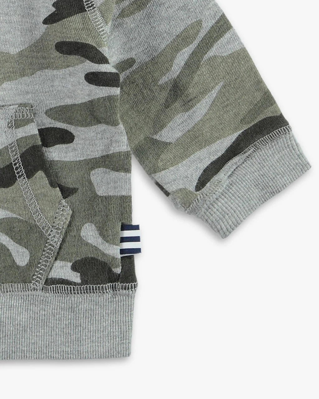 Classic front zip hoodie in camo print. Features front pockets and ribbed hem details for sporty comfort.