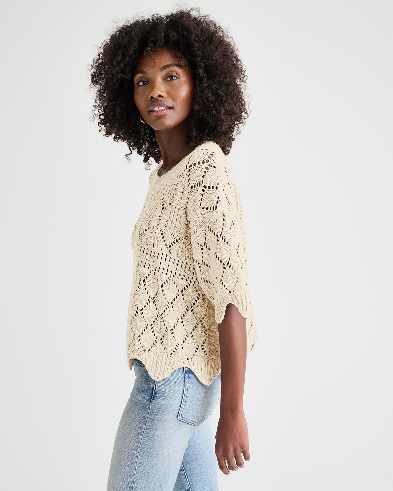 The pointelle detailing takes center stage in our crochet-inspired Diletta Short Sleeve Sweater. With an open and airy knit, scalloped edges and slightly cropped fit, this roomy sweater pairs great with your favorite denim or a silky skirt.