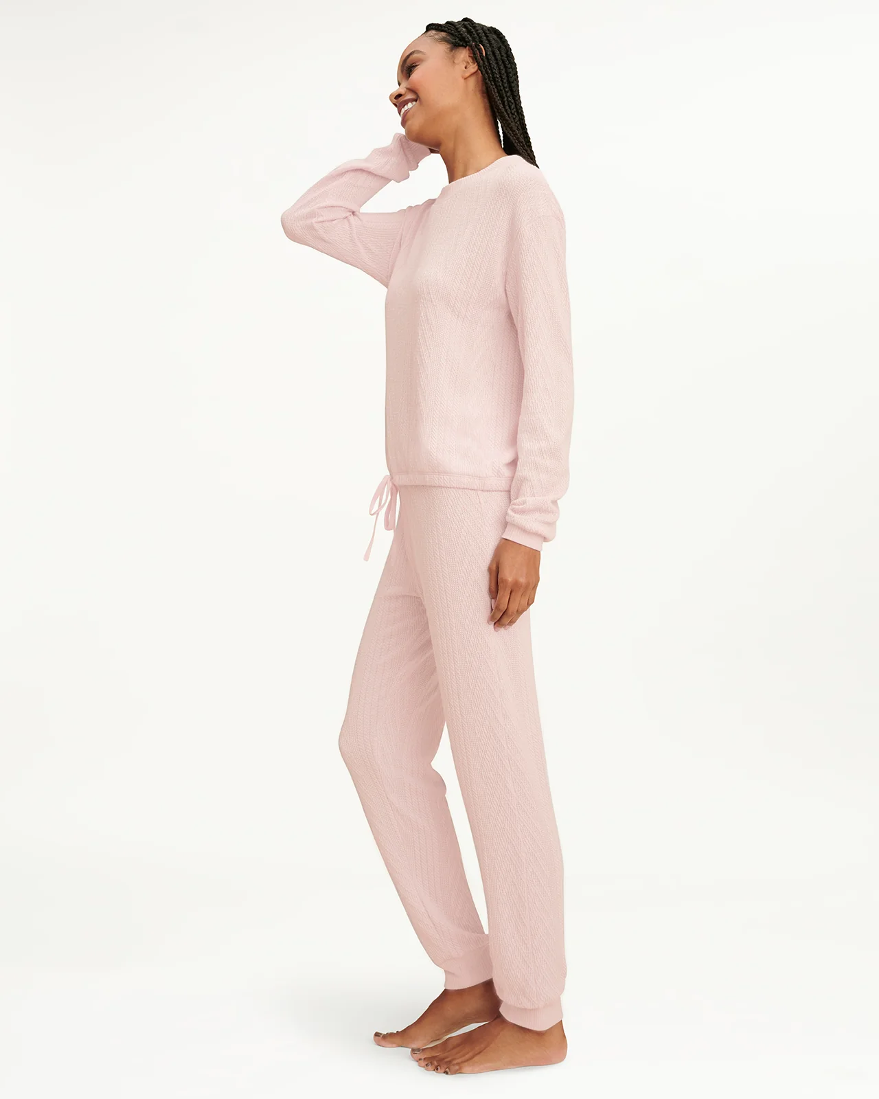 A classic cable knit pattern on a cozy topper and jogger set will leave you feeling ready for fall.