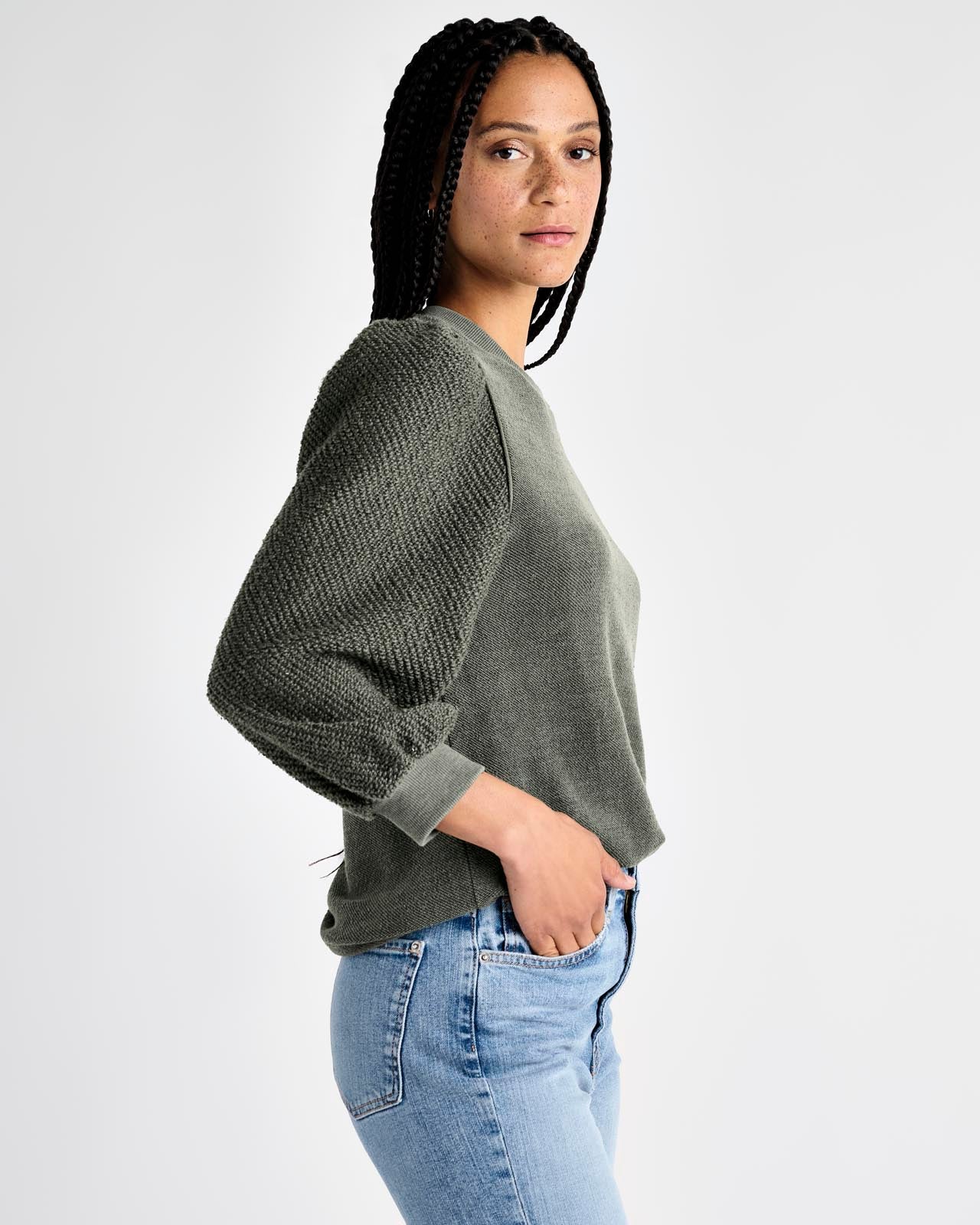 Bet you didn't think terry could look this good. Textured terry puff sleeves garner all the attention of our Evelyn Terry Pullover. Cut entirely from soft terry, the crew neck body has a smooth finish while the textured three-quarter length sleeves are designed in a charming puff shoulder silhouette with cozy ribbed trims. It looks lovely topped over joggers (like the matching Evelyn Terry Jogger) and jeans alike.