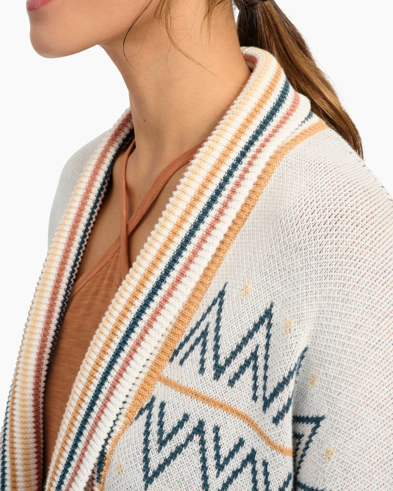 Our Geometric Print Cardigan is the ultimate layering companion to your summer wardrobe. Crafted from 100% cotton, it's completely breathable enough for a sunny day with the right amount of wrapped-up warmth for a breezy moment. The colorful print provides a pop of vibrant summer hues and the optional waist tie keeps it all together. We love how the rib trims are so inviting (hello cozy shawl collar).