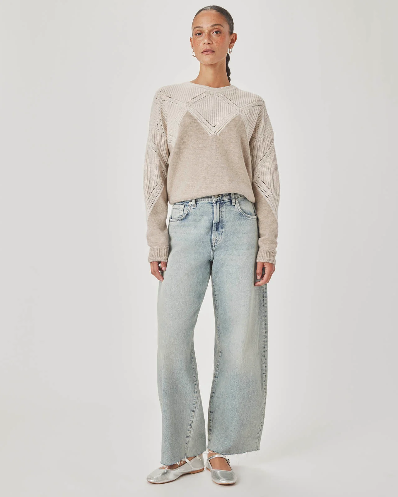 The Gretchen Sweater brings a fresh twist to your classic knit with an artful mix of textures and an easy, boxy fit. It features intricate pointelle detailing and ribbed accents that add subtle dimension. The dropped shoulders and mock neck lend a relaxed yet refined silhouette, making it perfect for pairing with high-rise denim or layered over flowy skirts for effortless balance.
