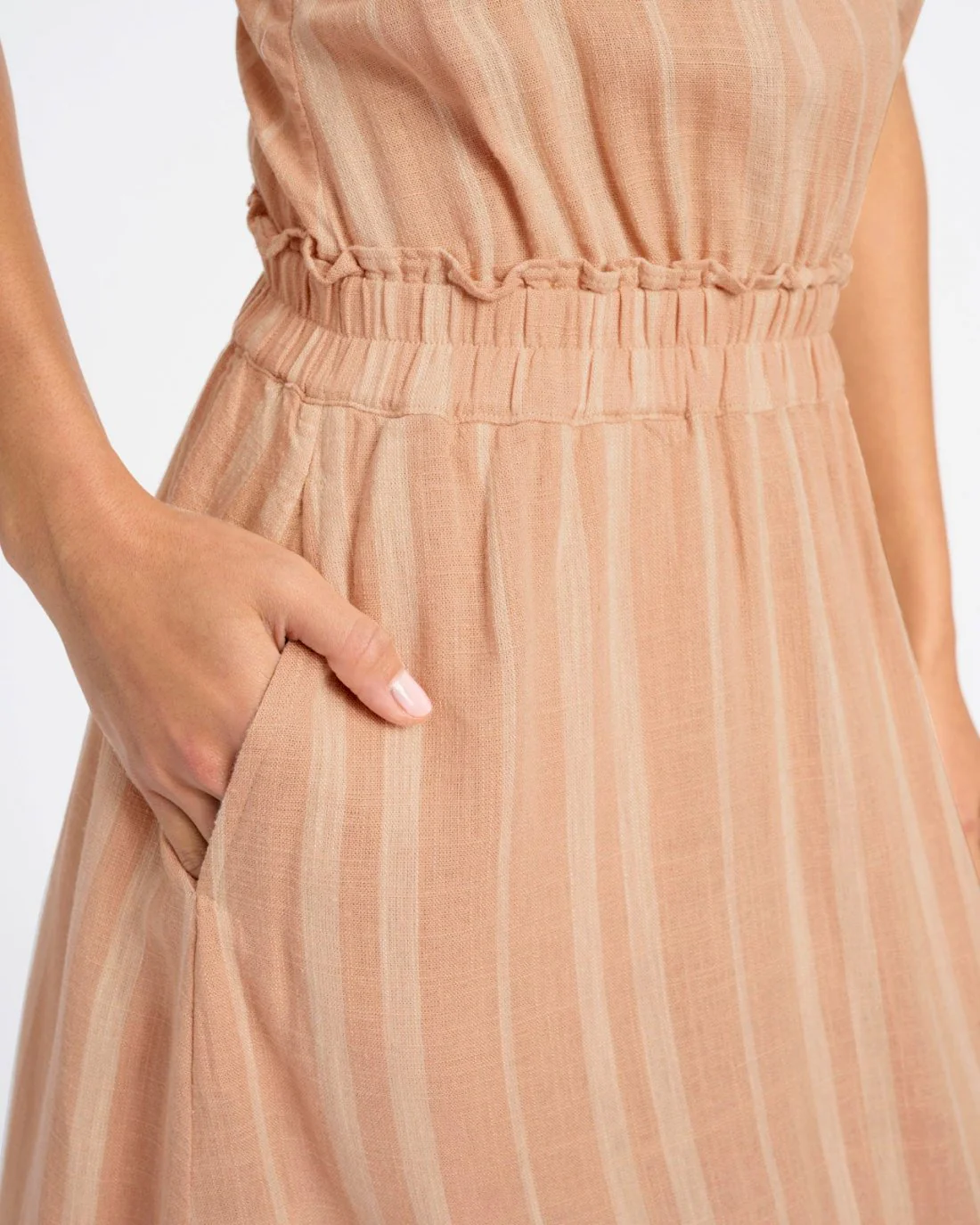 Sophisticated in the front and playful in the back. This is why you'll love reaching for our Bristol Dress. The high crew neck leaves just enough space for a delicate chain or two while the back scoops down into a square open back. The ruched straps keep everything in place (while also covering any sign of bra straps). The stretch waist and hidden pockets are just the icing on top-- all of this crafted from a yarn dyed linen blend so you're never not refreshed.