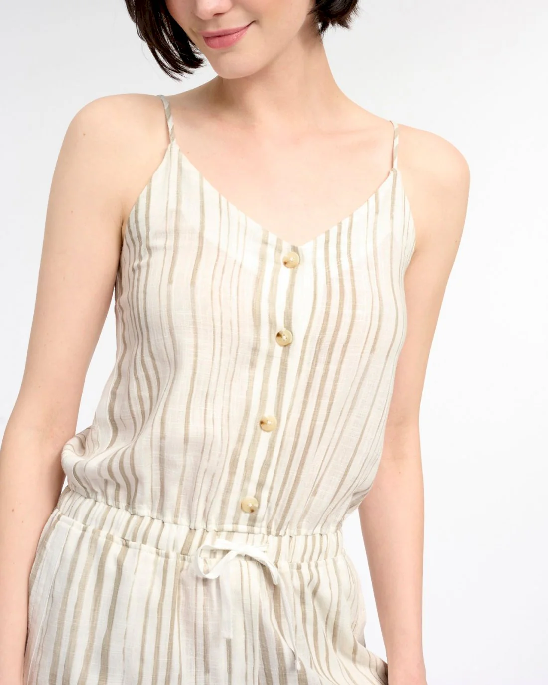Warm weather friendly? Yes. Charming silhouette? You bet. Beautiful craftsmanship? See for yourself. Our Sedona Romper is a one-and-done summertime one-piece designed with beautiful details in mind but most of all: your comfort. The herringbone tape trims run throughout the spaghetti straps (did we mention they're adjustable?), down the side seams, and on the drawstring waistband. Those lovely tortoise buttons and the cuffed hem give it a luxe finish. And best of all, it's crafted from a woven linen blend to keep you cool as a cucumber all summer long.